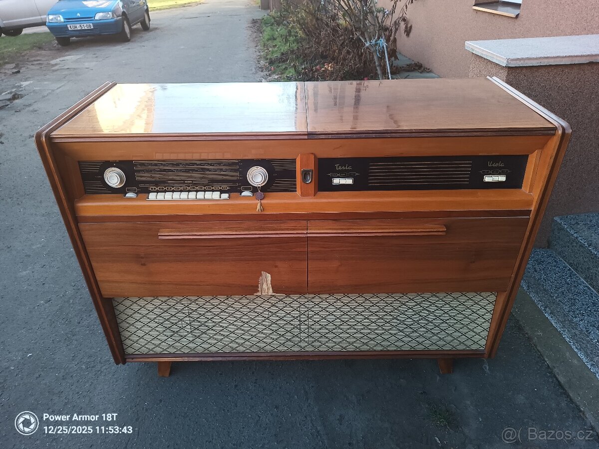 Nabízím Hudební skříň / Gramorádio Tesla 1105 A Viola 1959-61,návody na používání,rádio, magnetofon, gramofon funkční, osvětlení funkční, rádio je „předělané / upravené na FM.. Jediná vada na kráse je kus uštipnutých dvířek viz foto,jinak v pěkném stavu.