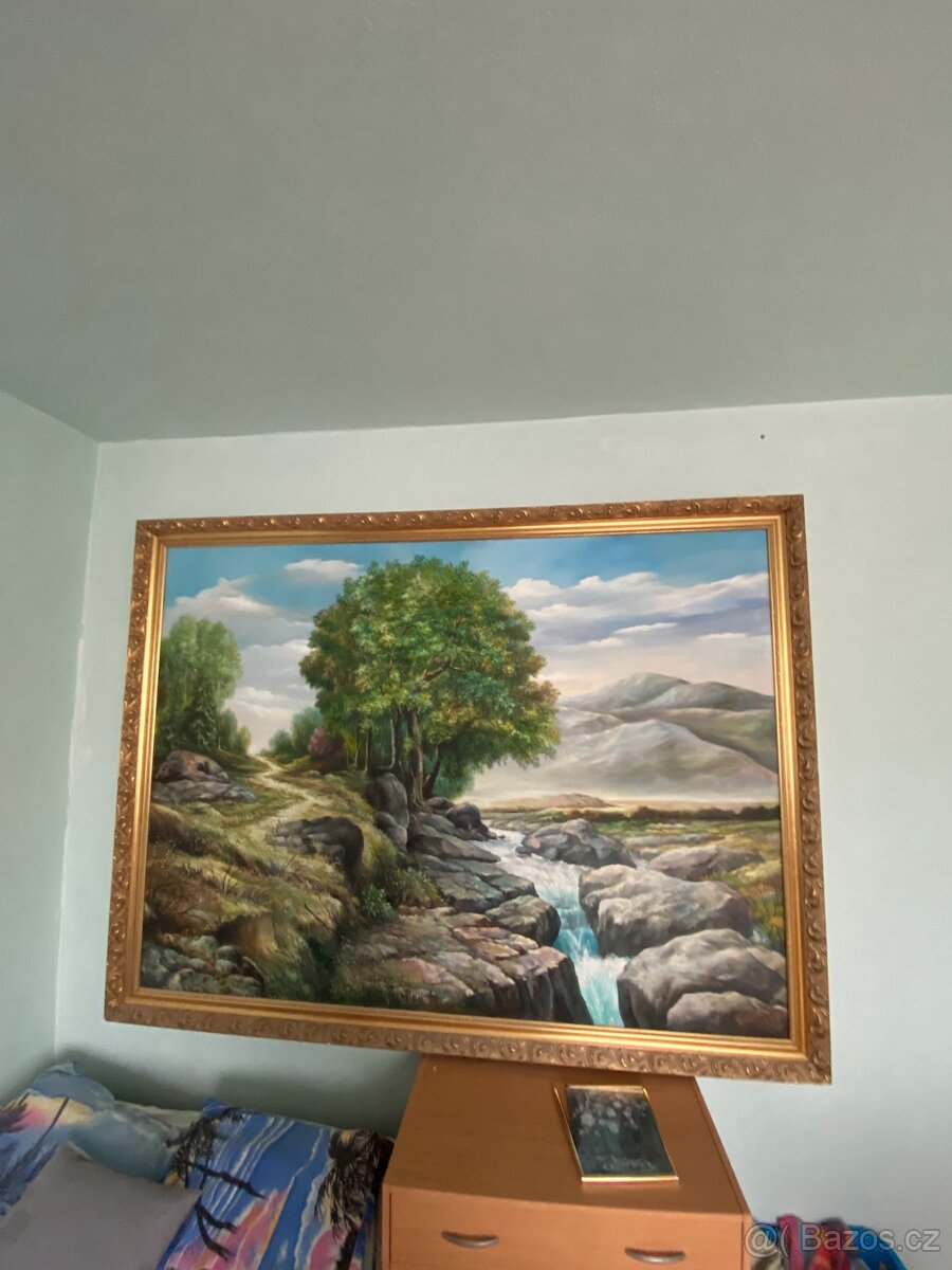 Nabízím k prodeji rozměrný obraz – olejomalbu na plátně s krajinářským motivem (řeka, skály, stromy, hory v pozadí). Obraz je signovaný a datovaný (dle signatury cca 1993).