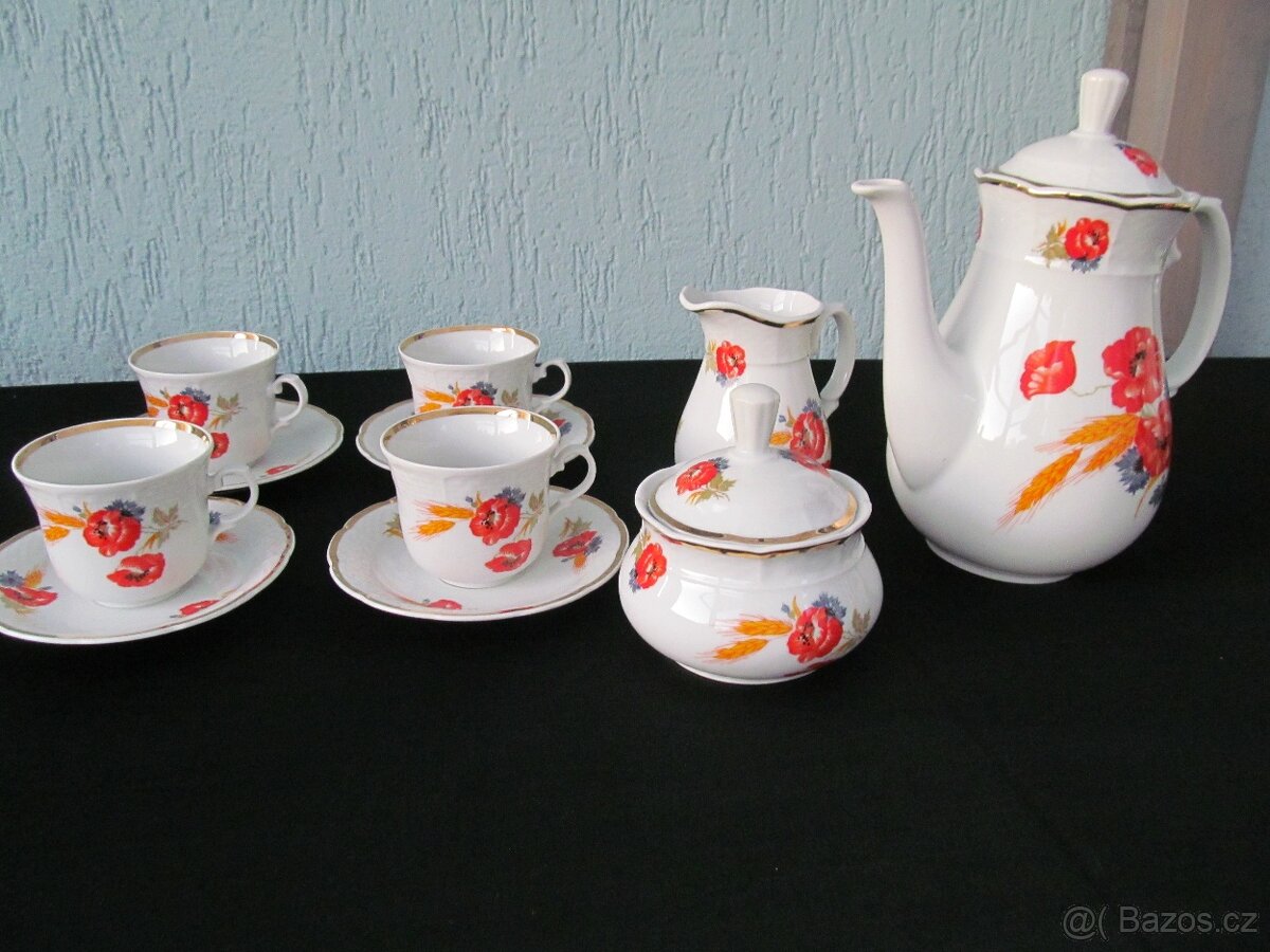 Průměr šálku je 7,8 cm, výška 6,8 cm, průměr podšálku je 13,5 cm. 4 hrnéčky s podšálky , cukřenka, mléčenka konvice
