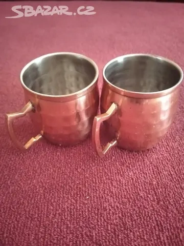 2 ks. roztomilé kovové hrnečky, měděný plášť uvnitř niklovaný, kladívkový dekor, ouška litá, bytelné.