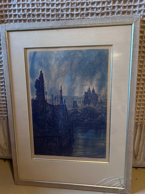 Krásný obraz zachycující pohled na Hradčany a Vltavu v jemných modrých tónech. Dílo působí klidným a romantickým dojmem, ideální pro milovníky Prahy a její historie. Zarámováno v decentním světlém rámu s paspartou, která zvýrazňuje detailní práci autora.