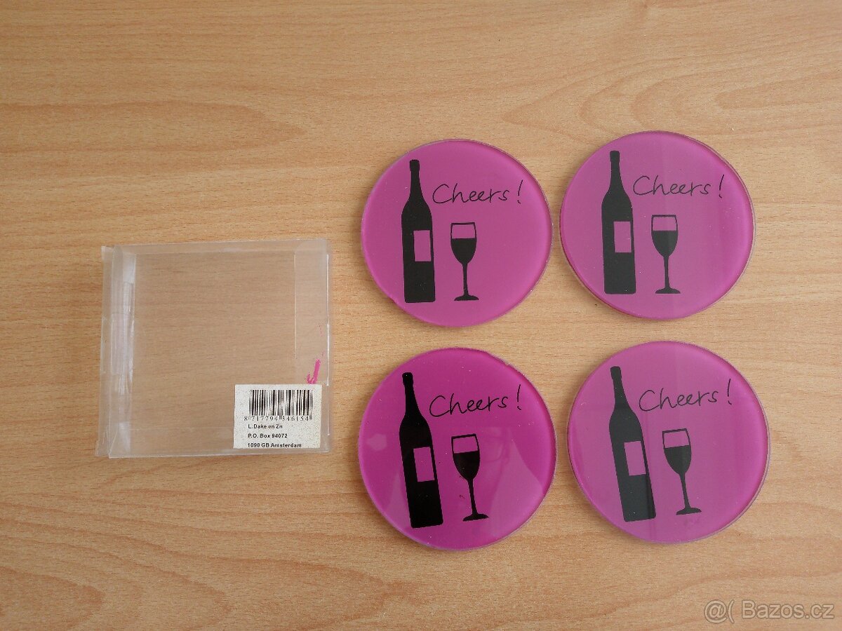 Nabízím skleněné podtácky s nápisem Cheers , 4 kusy