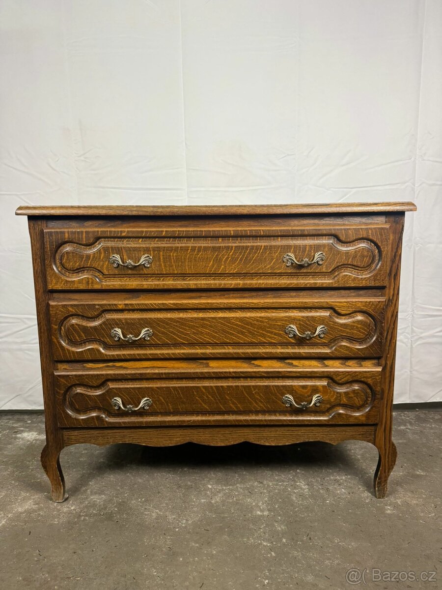 Krásná menší komoda z masivního dřeva s přirozenou kresbou a teplou patinou. Čisté proporce doplňují profilované čela zásuvek, jemně tvarované nohy a dekorativní kovové úchyty, které podtrhují její klidný, nadčasový charakter.