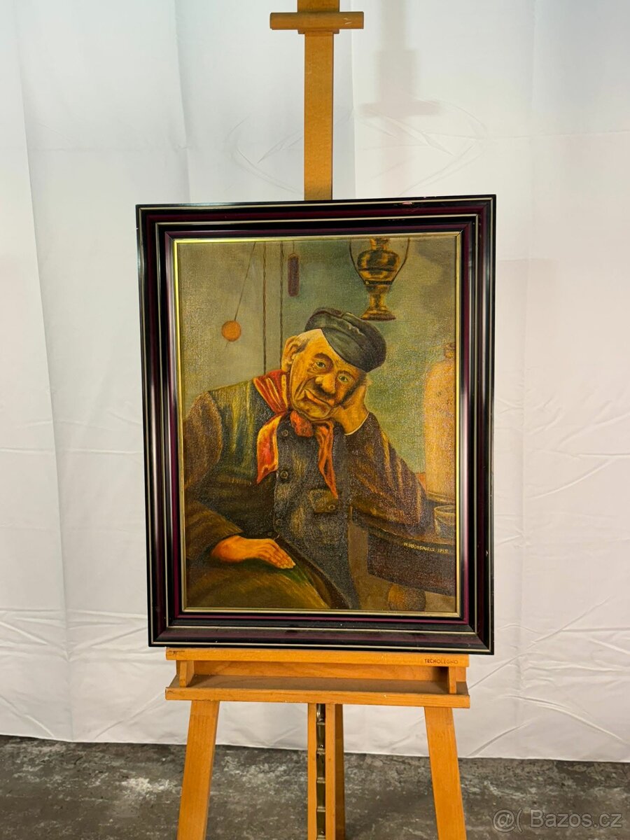 Výrazná olejomalba s melancholickým portrétem staršího muže v interiéru. Dílo je signováno H. Voorspoels, 1948, pochází z poválečného období a nese znaky středoevropské / beneluxské figurální malby 40. let 20. století.