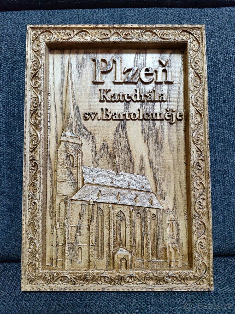 Prodám nový dárkový obraz Plzeň Katedrála sv. Bartoloměje. Velikost 300x210 (A4). Materiál jasan je voskovaný a leštěný.