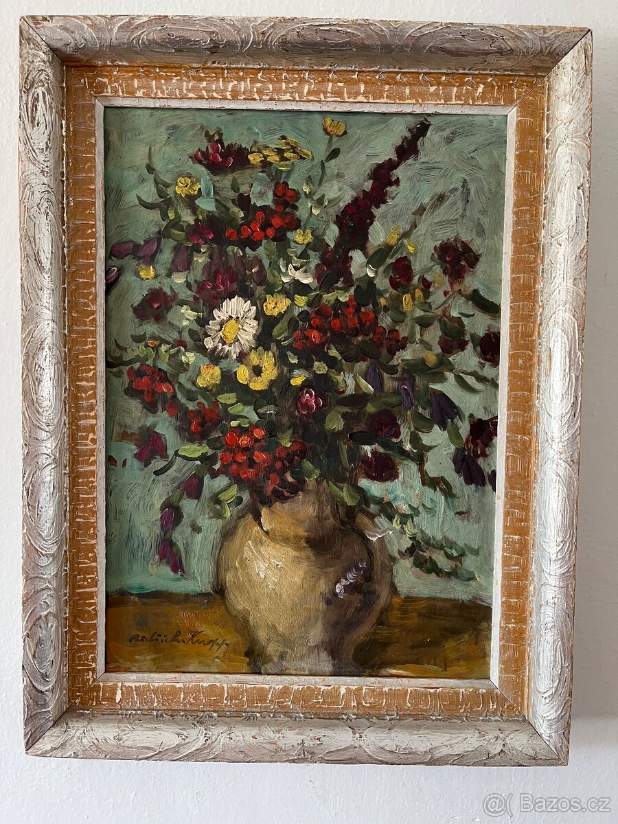 Originál obraz signovaný R. Mlejnková - [1.1. 2026]Krásný malovaný obraz z pozůstalosti, kytice růží ve váze, originál signovaný R. Mlejnková. Rám v barvě červeného zlata. Barvy obrazu i rámu krásně sladěny v teplých tónech.