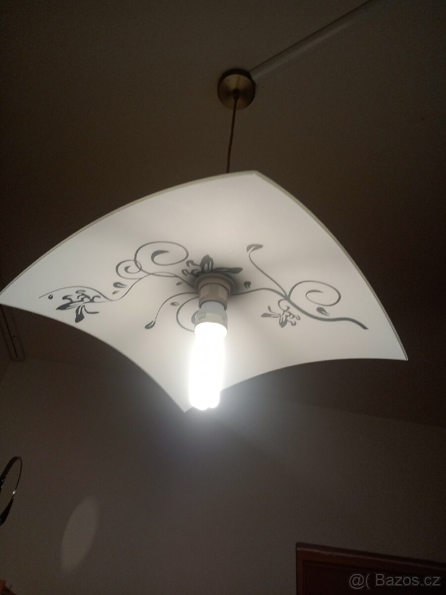 Reprezentativní šestiramenný lustr - [28.12. 2025]Nabízím do vaší haly, obývacího pokoje nebo kanceláře velmi pěkné šestiramenné stropní svítidlo na řetězu se stropní růžici. Kovové prvky ani skleněná stínidla nejsou poškozené. V případě zájmu lze převzít i v Praze.