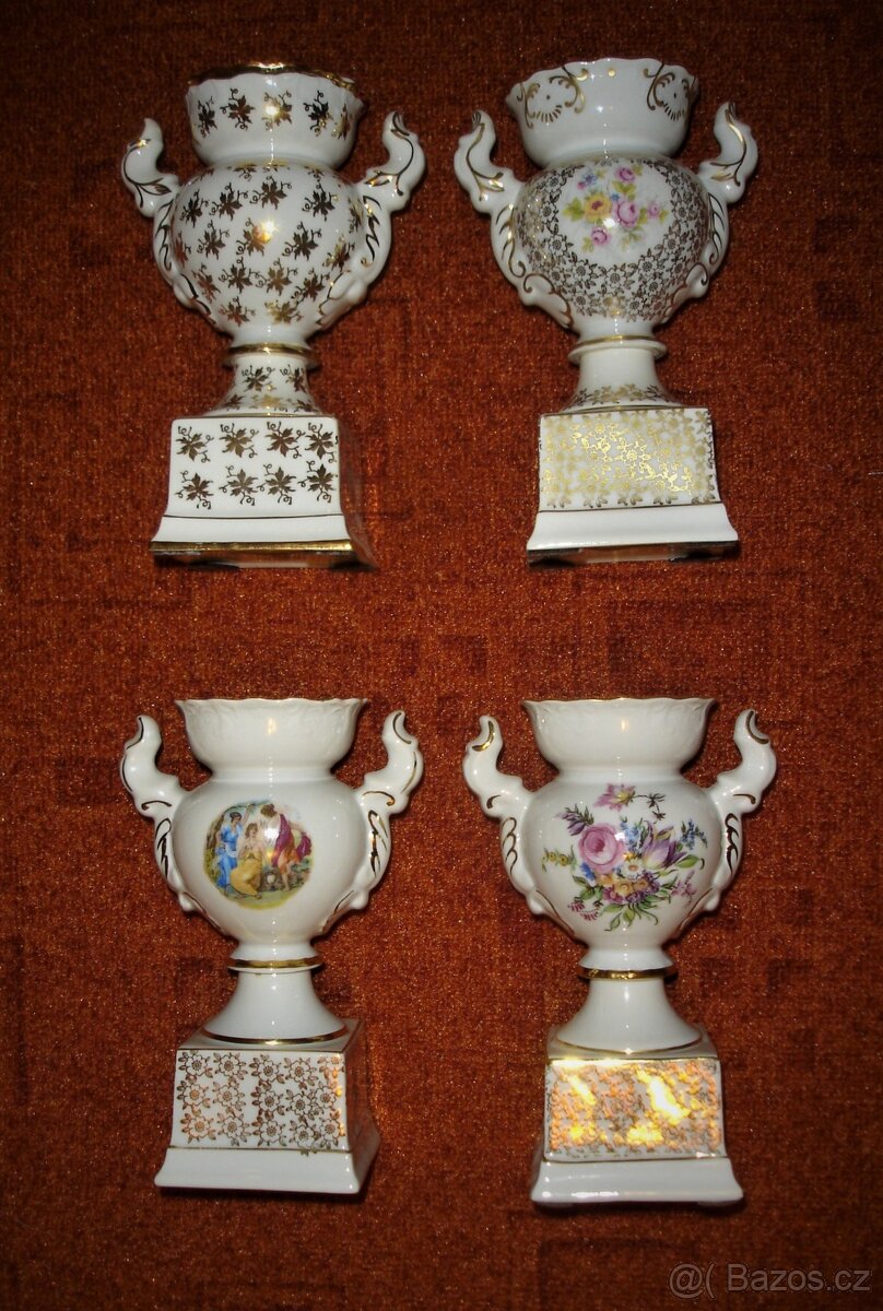 Prodám tyto čtyři nádherné porcelánové vázy ve tvaru amfory na pevném podstavci. Kvalitní český porcelán. Každá je jinak zdobená. Výška je 19 cm.