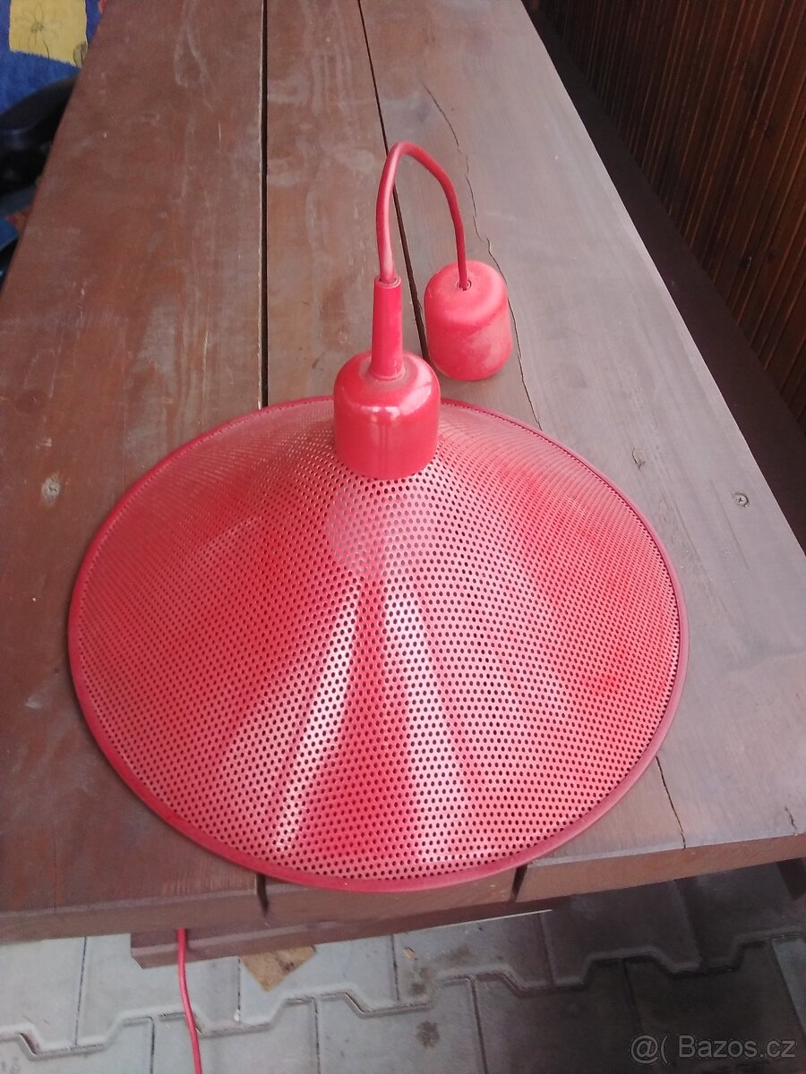 Červený lustr plastovy.