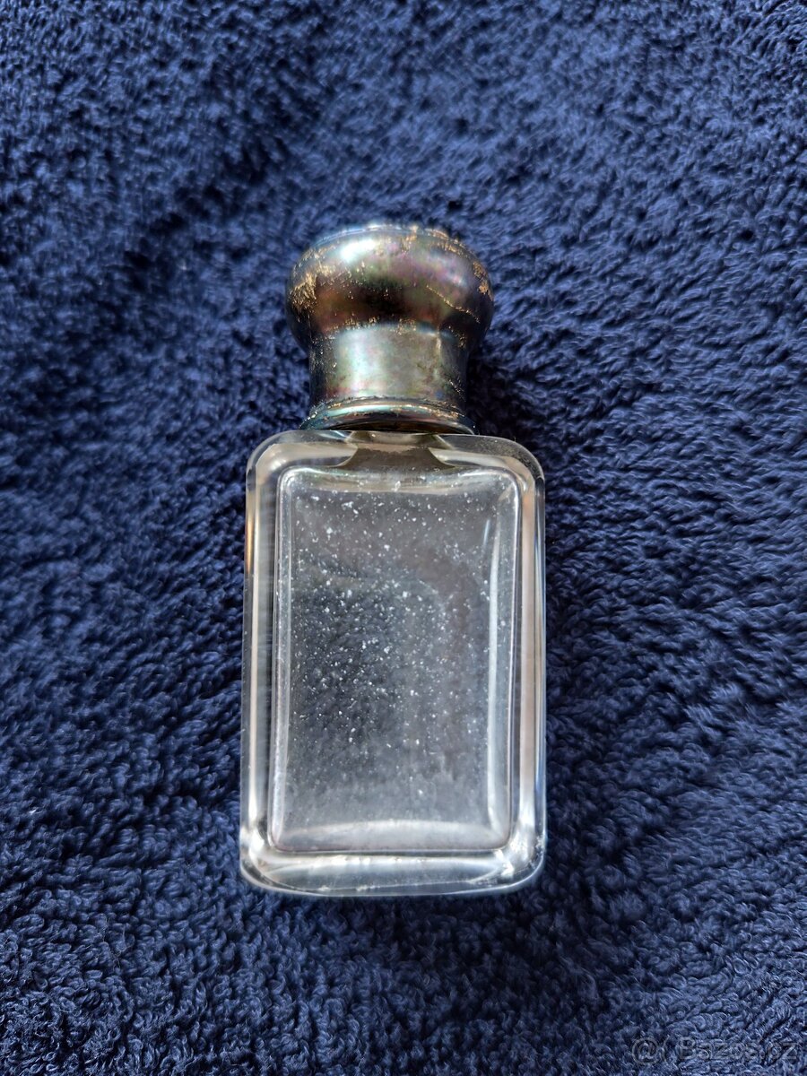 Prodám skleněný celoplošně broušený flakonek se stříbrným šroubovacím uzávěrem, částečně zdobeným a opatřeným monogramem PR. Uzávěr je opatřen puncovní značkou pro cizozemské zboží(lilie s písmenem č) a ryzostní značkou 925. Váha uzávěru je 10.7gr.součástí lahvičky je korkový špunt a silná vůně uvnitř. Velikost v83mm,š36mm. Předmět pochází z mých sbírek. Osobní převzetí uvítám. Jinak podle domluvy.kontakt prosím pouze tel na č 777930350 Beroun