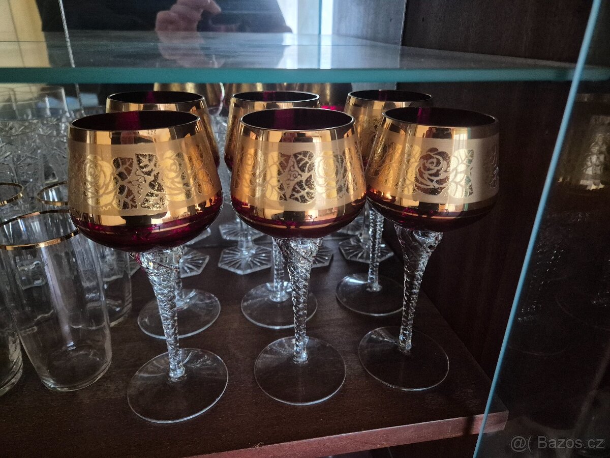 🥀 Sklenice mají sytou červenou barvu (tzv. rubínové sklo), bohatě zlacený dekor