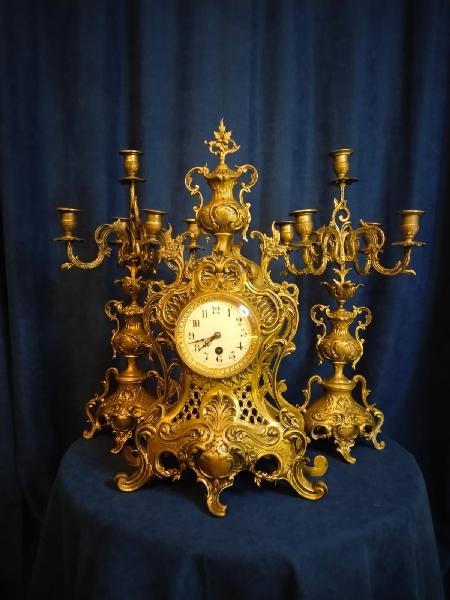 Starožitné, chodové, stolní hodiny se dvěma svícny. Souprava - bronz