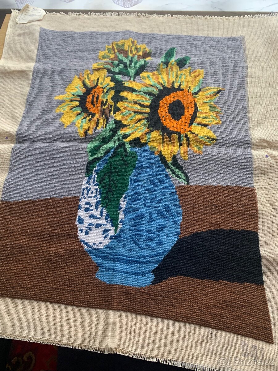 Vyšívaný obraz 118 x 70 cm - [9.12. 2025]Velký ručně vyšívaný obraz - zátiší s květinou, zasklený v masivním rámu, zachovalý. Předání osobně, sídliště Černý Most.