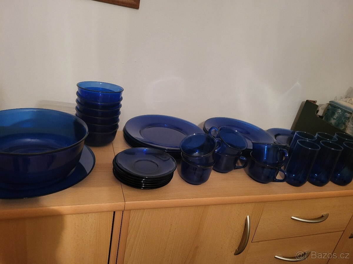 Prodám jídelní soupravu 6x hluboký talíř, 6x mělký talíř, 6x dezertní talíř, 6x sklenice, 6x hrníček, 6x podšálek, 6x miska, 1x velká mísa a 1x velký talíř, celkem 44 ks. Modré sklo. Nové, nepoužité, nevhodný dar. Přeloučsko, preferuji osobní odběr.