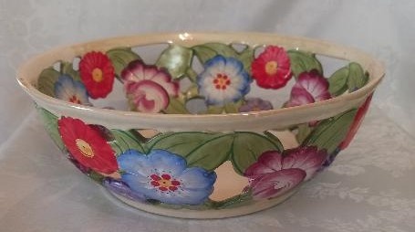 Mísa o průměru 23 cm a výšce 8 cm je ručně malovaná chodská keramika. Mísa je místy záměrně perforovaná. Zřejmě je určená na ovoce.
