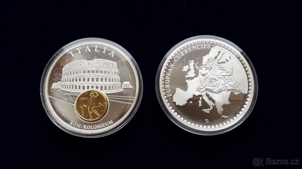 Prodám velkou postříbřenou medaili Italia o průměru 5cm s charakteristickou stavbou Colosea. V medaili je vložená pozlacená replika dříve platné mince o průměru 2cm.