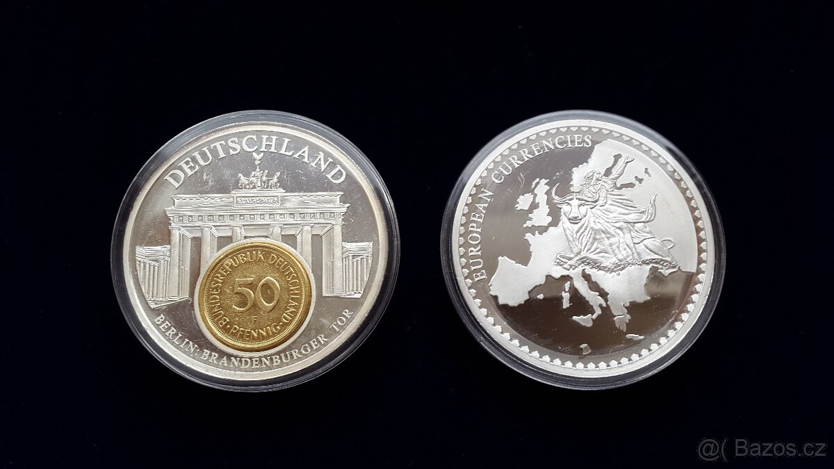 Prodám velkou postříbřenou medaili Deutschland o průměru 5cm s charakteristickou stavbou Brandenburgské brány. V medaili je vložená pozlacená replika dříve platné mince o průměru 2cm.