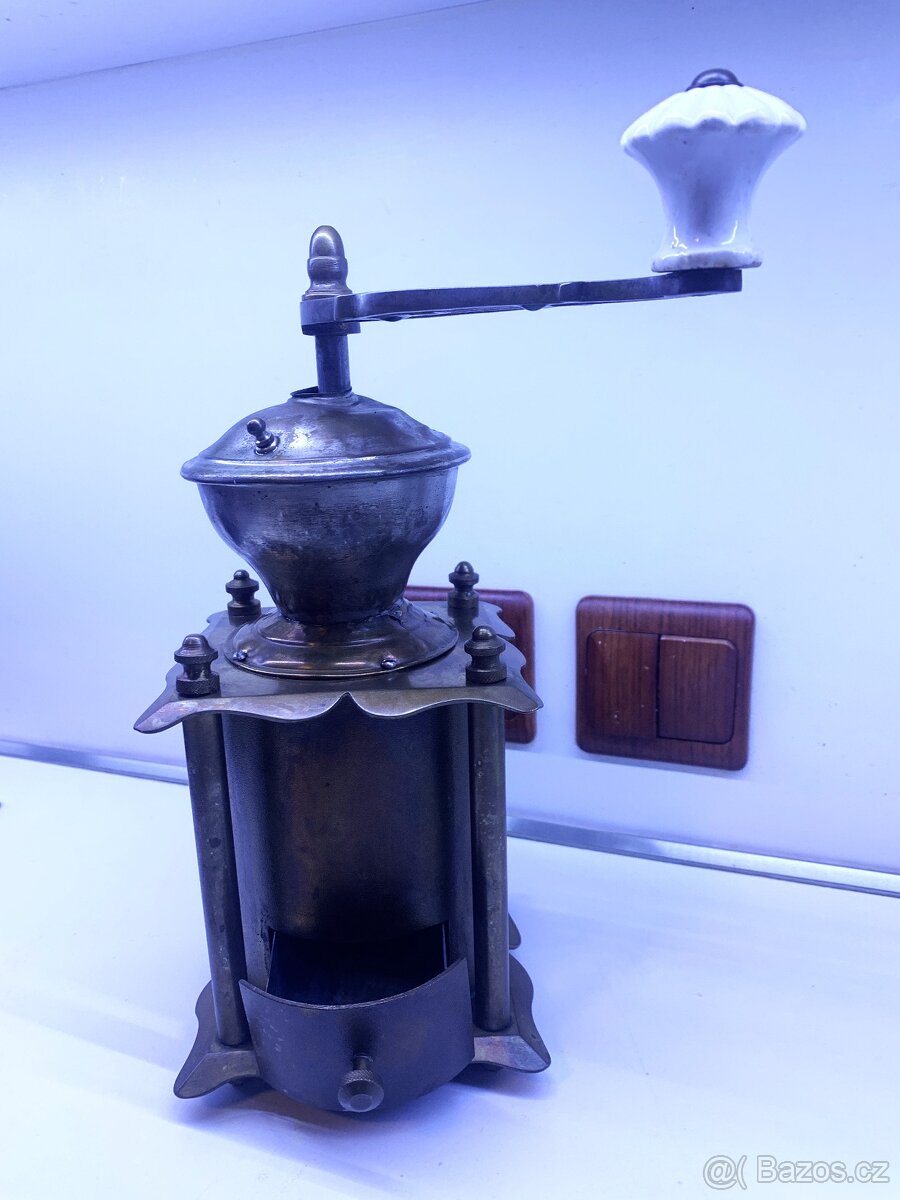 Starožitný mosazný mlýnek na kávu,funkční výš. 23cm.Odběr vP-10 cena 4 500,- prosím v případě zájmu volat 724051870