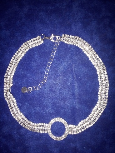 Efektní třířadový náhrdelník vpředu s jemně zdobeným kroužkem z bílého (stříbrného kovu), s nastavitelným obvodem kolem krku. Nejkratší obvod je 31 cm, nejdelší je 39 cm.