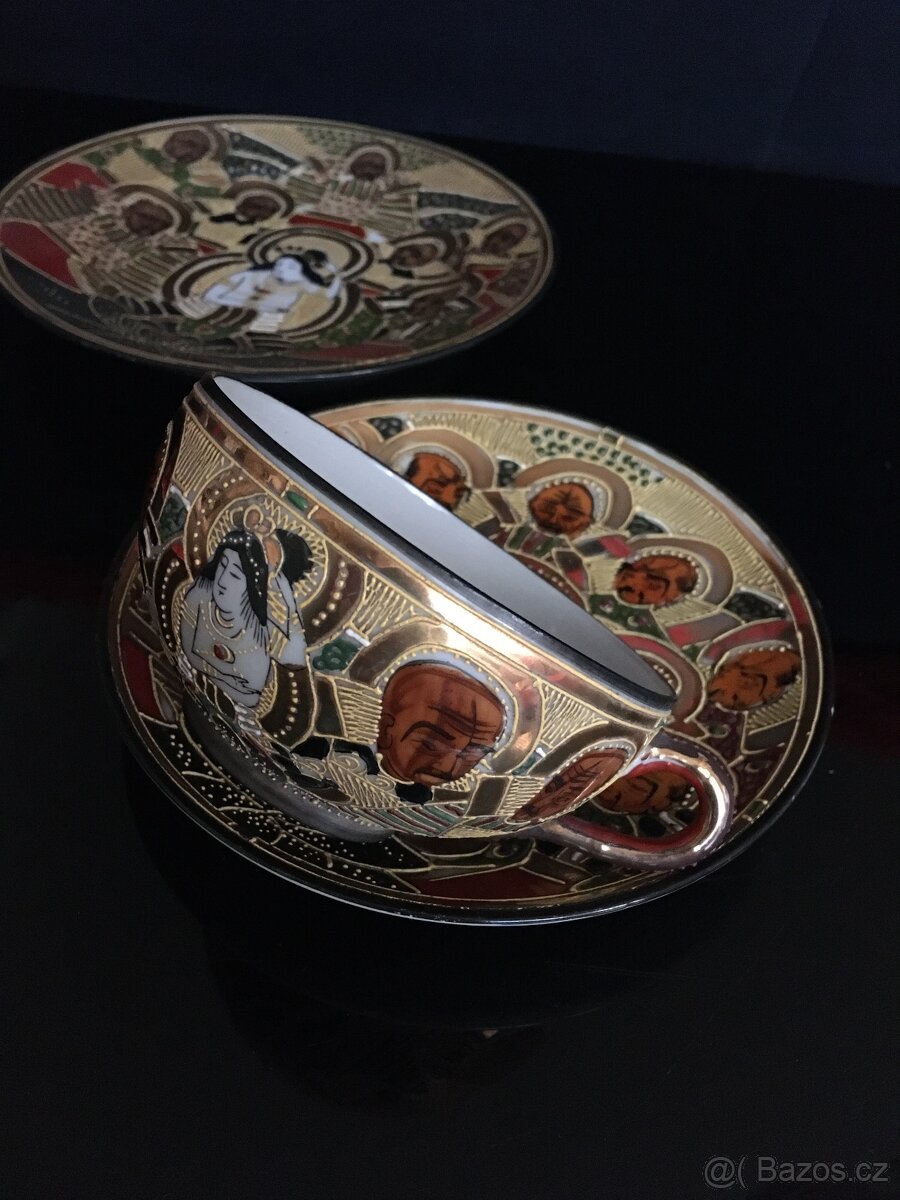 Japonský tenkostěnný porcelán s precizní malbou smalty, talířek, podšálek a šálek - vše ve výborném stavu
