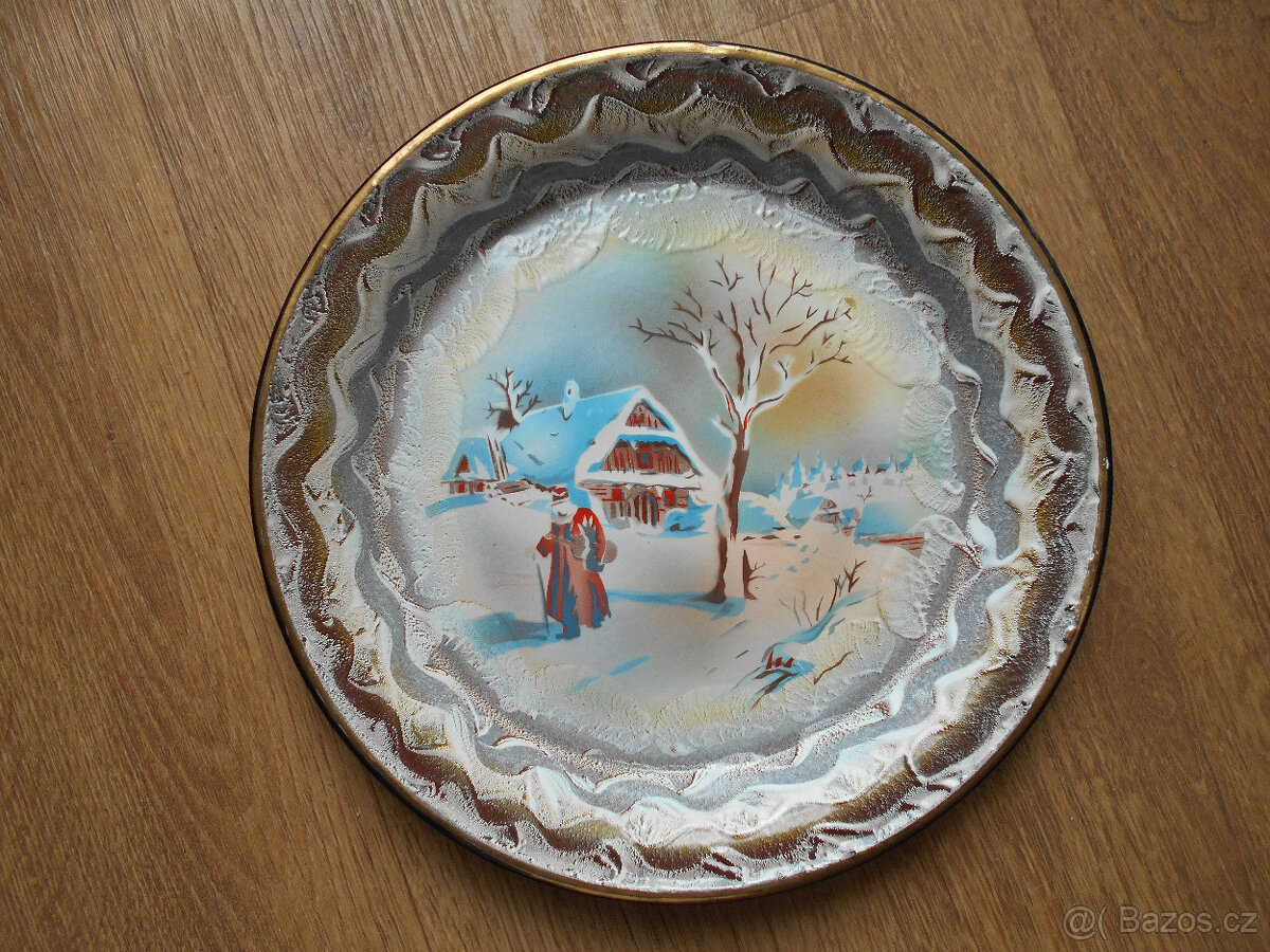 Starožitný, smaltovaný tácek. Zimní, vánoční motiv.