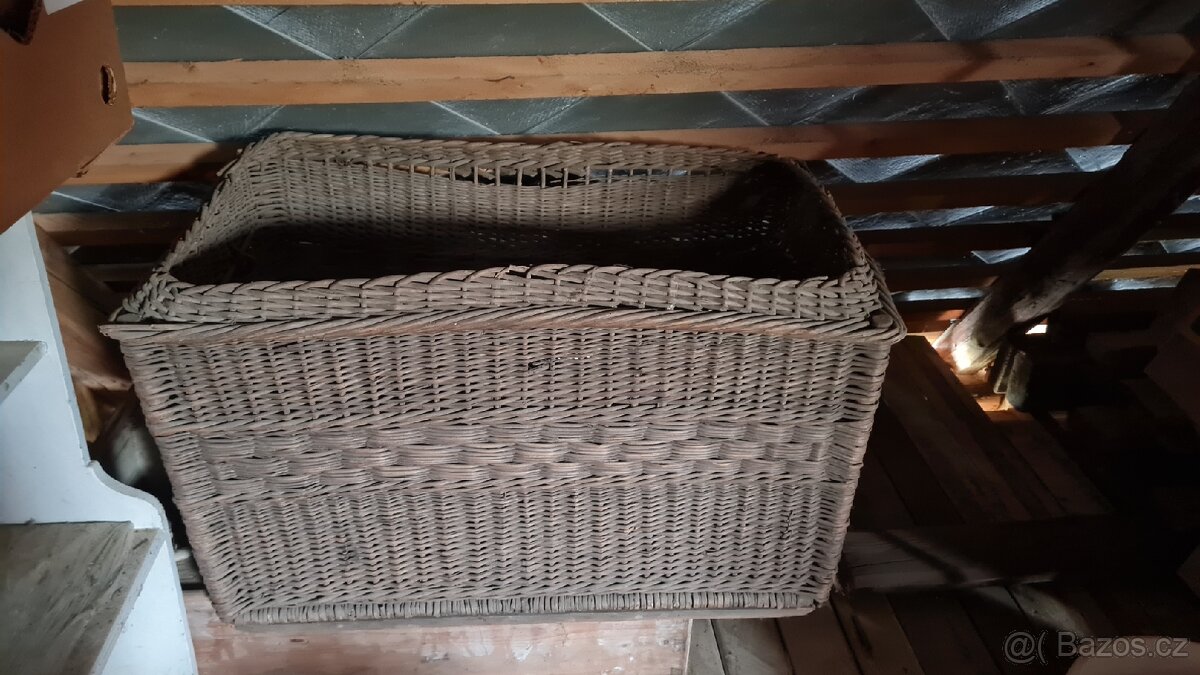 Starý proutěný koš nebo truhla, možná mohlo být i na auto. Nemá víko. Rozměr 90 d x55 s x45 v. Osobní převzetí Kokořínsko.