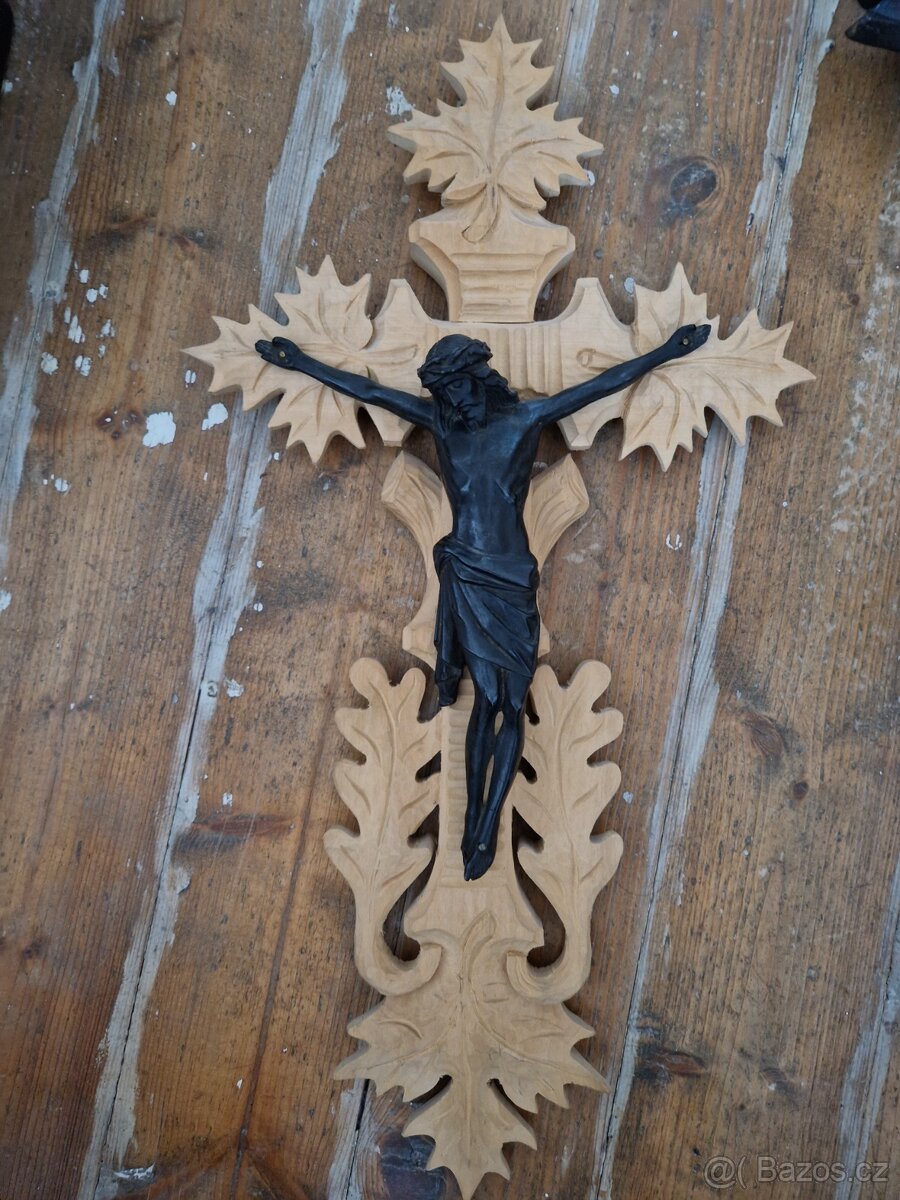 Ručně vyřezávaný dřeveny křiž ze světlého dřeva 52x27 cm s černým kovovým korpusem 22x19 cm. V krasnem stavu, akorat ulomený konec špičký nohy na korpuse.