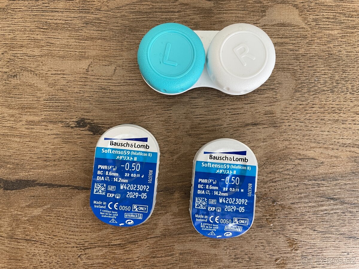 Prodám dva páry kontaktních čoček firmy Basch & Lomb: SofLens 59. Dioptrie -0.50, zakřiveni 8.6mm, průměr 14.2mm. Mají expiraci 5/2029.