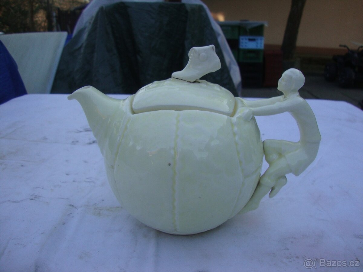 Prodám tuto starožitnou čajovou kávovou konvičku s raritním tvarem fotbalového míče, držadlo je ve tvaru fotbalisty a ouško nahoře kopačka. Výroba 1. republika, zespodu číslo 2311. Jediná vada je že horní ouško kopačka byla ulomená a je slepená, šlo by jistě ještě lépe slepit a zaretušovat, že by nešlo poznat, je to hodně stará oprava. Je to velice raritní námět, ještě jsme v tomto provedení nikdy neviděl.
