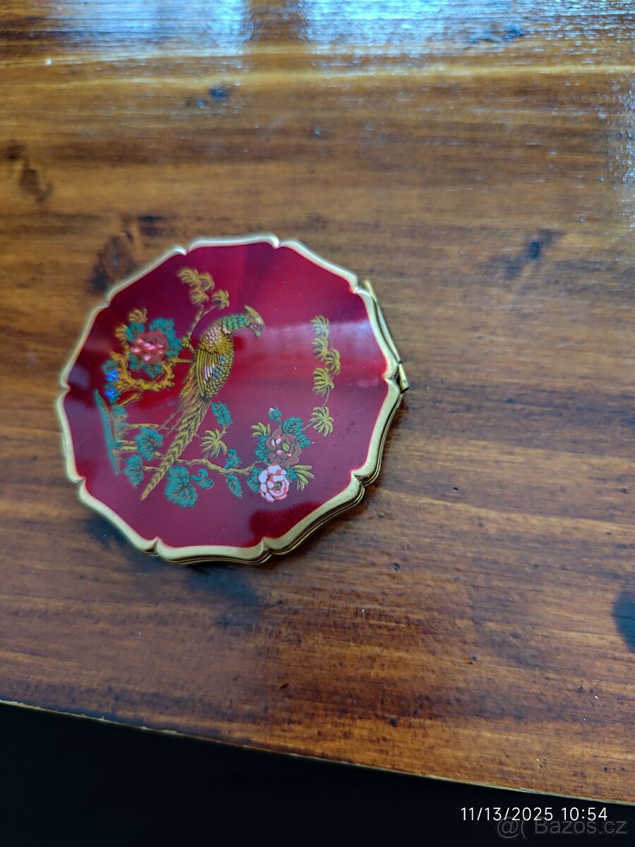 Starozitna kompaktni pudrenka zn.Stratton - England, krasne provedeni s pavem - viz foto, ve zlatem tonu. Ve vyborne stavu, vse funkcni vcetne pantiku a puvodniho sitka na pudr.