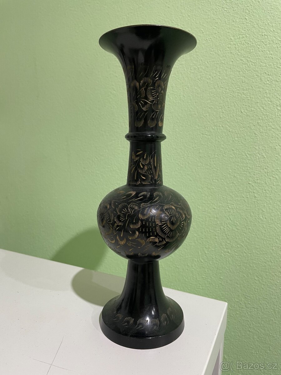 Prodám elegantní kovovou vázu z Indie, dekorativní kus v etno / retro stylu.