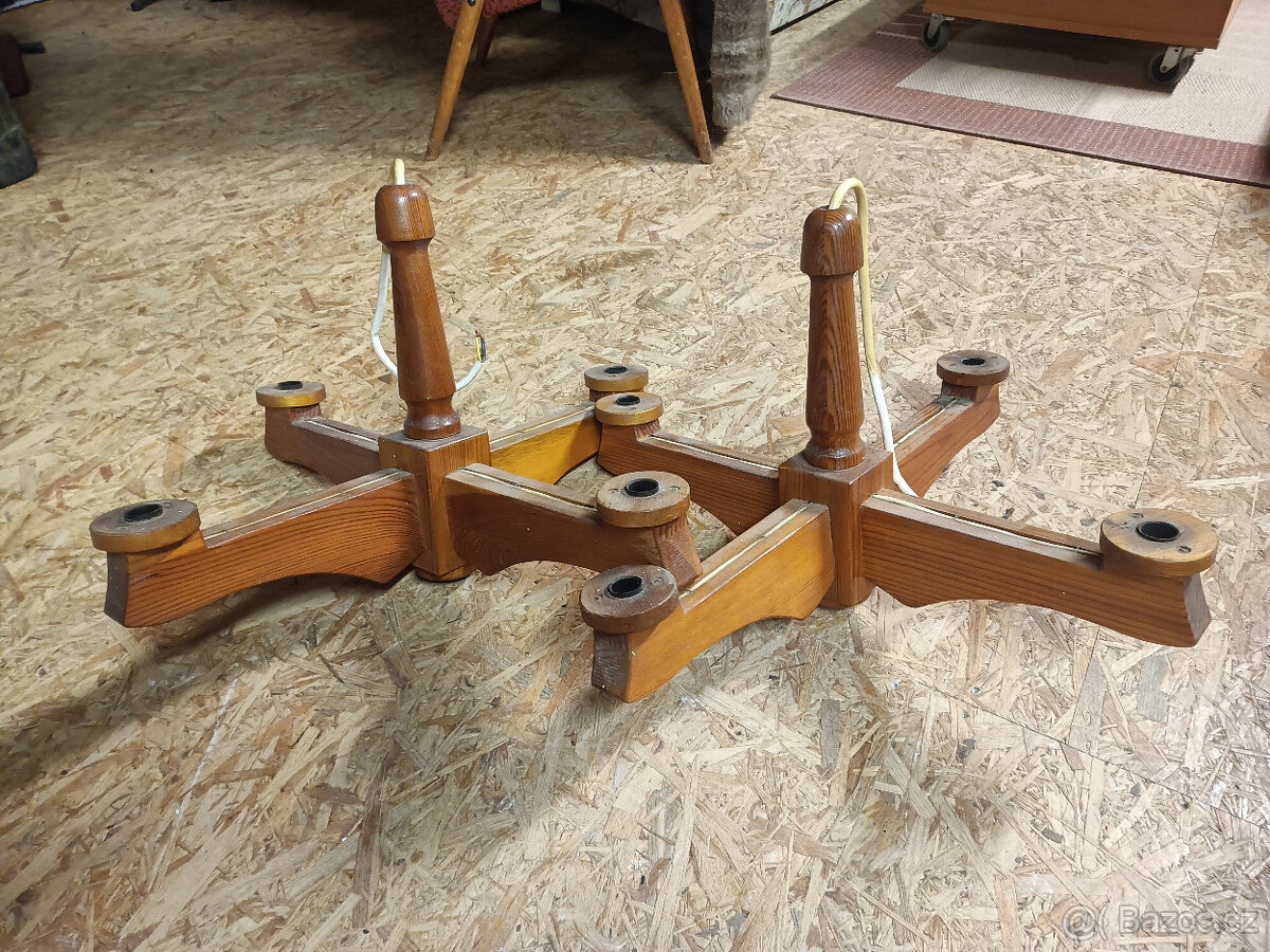 Materiál dřevo. Do odmontování funkční. Pro žárovky s E14 paticí. Zaprášené od skladování, nečištěno.