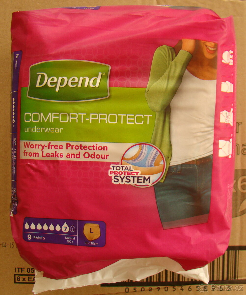 Prodám absorpční natahovací kalhotky pro ženy Depend Normal velikost L. Balík s 9 ks za 110 Kč.