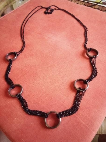 Efektní delší náhrdelník s kroužky ze zvlástního lesklého kovu na dvojitém jemném černém řetízku. Originál kus. Nový, nenošený.