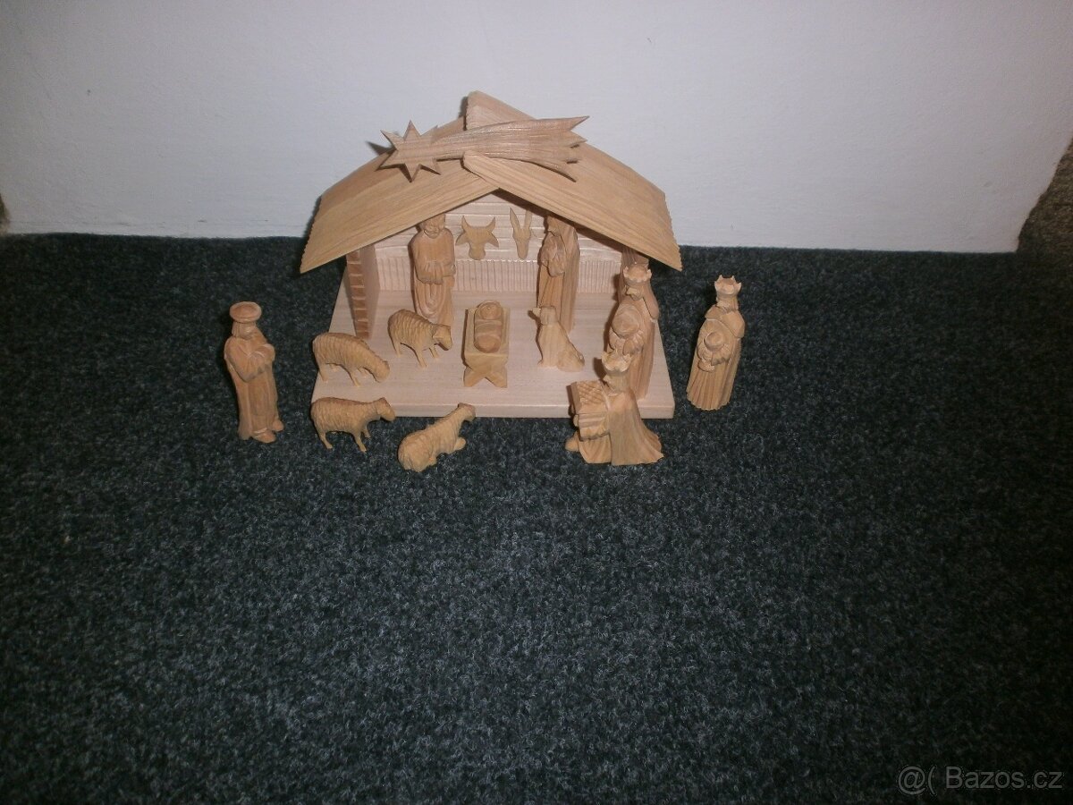 Dřevěný ručně vyřezávaný betlém,velikost domečku šířka=25cm, hloubka=10cm, výška=17cm, figurky jsou vysoké cca 10cm, vyřezané z lipového dřeva, bez povrchové úpravy. Vůl a osel jsou pouze jako reliéf na zadní stěně domku.
