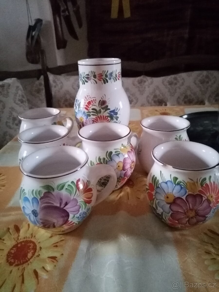 Nepoužité pouze vystavené ve vitrine, různé hrnečky z Chodské keramiky, růžového porcelánu.