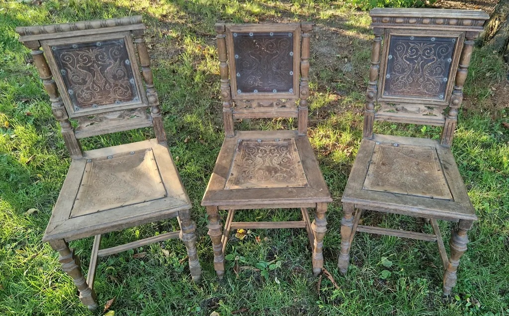 Prodám 3 ks starožitných židlí v nálezovém stavu,viz foto. rozumné dohodě o ceně se nebráním.