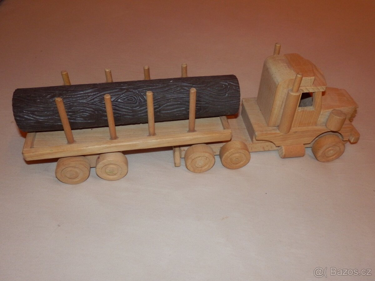 Prodám dřevěný ručně vyrobený pojízdný model tahače s návěsem pro přepravu dřeva s imitací dřevěné klády. Celková délka soupravy 36 cm. Šířka 9 cm. nejvyšší výška 12 cm. Délka samotného tahače 21 cm. Dřevo impregnováno bez laku a barvy viz foto.