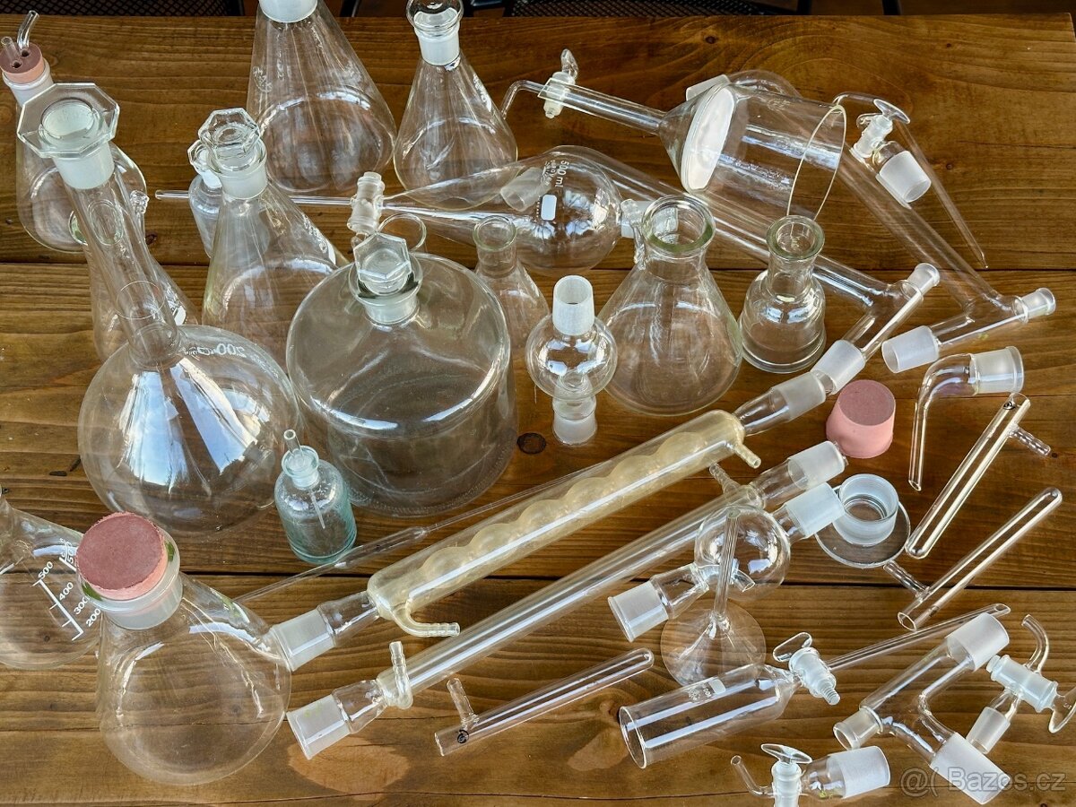 Prodám konvolut chemického skla - lahve, baňky, pipety, chladiče, filtr, nálevka, prachovnice, spojovací kusy a jiné.