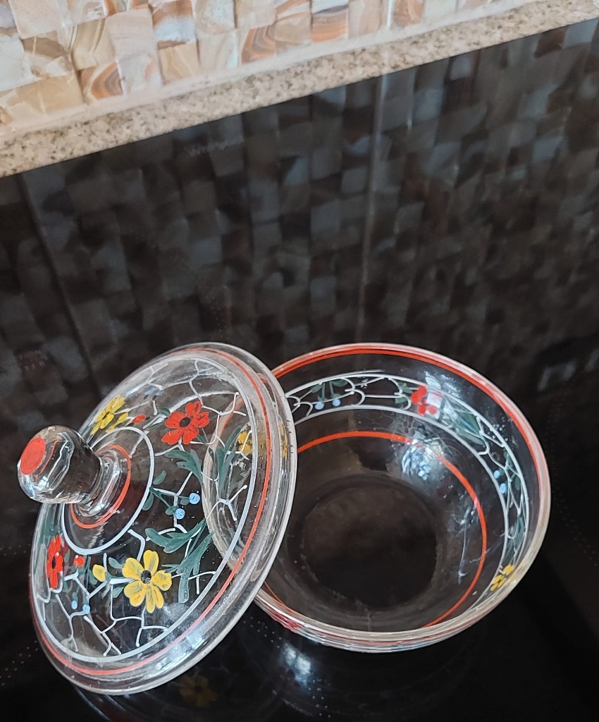 Skleněná,ručně malovaná cukřenka, top svav,bez oťuků. V-11cm, průměr 14cm