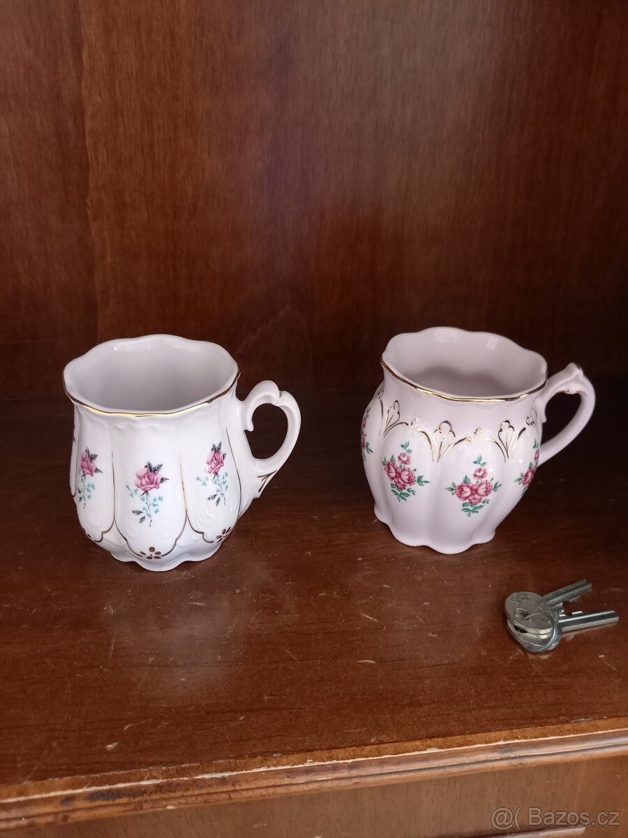 Prodám 2 hrnky z růžového porcelánu značky HaC zdobené 24 karátovým zlatem, a to i jednotlivě za 300 Kč za kus. Osobní odběr je možný v Pardubicích a po dohodě i v Praze, popř. je možno zaslat výlučně však přes zásilkovnu.
