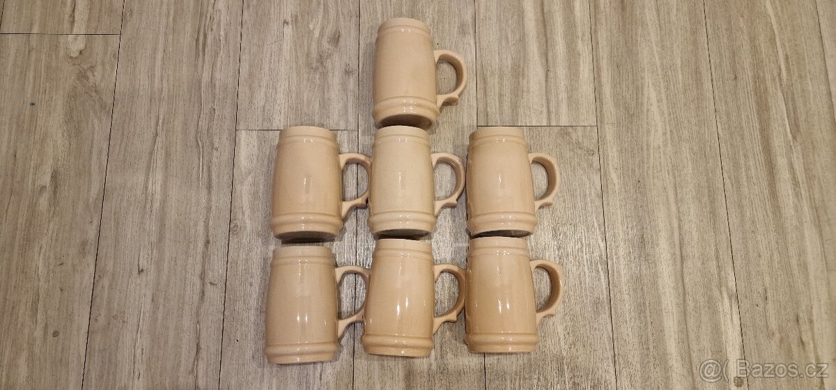 Prodám 7ks nových keramických (porcelánových) půllitrů (ušáků). Asi je to ruční výroba, ale nevyznám se v tom.
