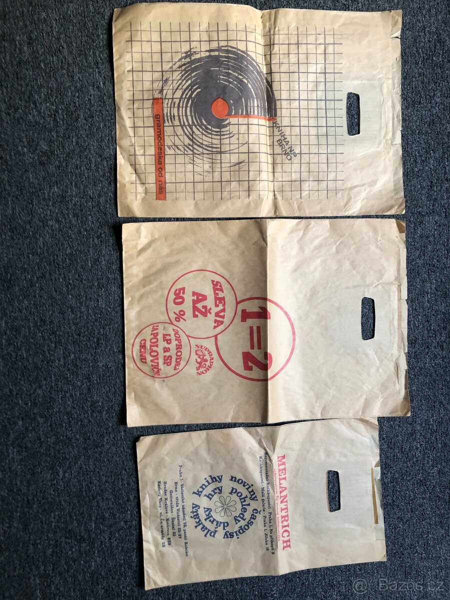 Tašky na gramodesky, různé obaly a krabičky s firemními logy, čokoláda, punčochy ..Retro