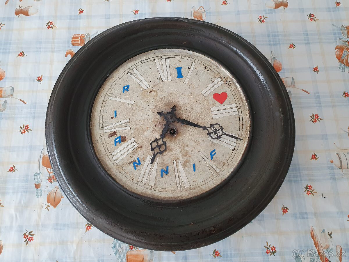 1. Nástěnné hodiny kulaté bůhvíjak staré. Průměr cca 37 cm. MPK - Josef Muhlhauser/Pleskot Karlstein Vídeň? Klíč mam, ale po natažení nejdou, takže bez záruky na funkčnost.
