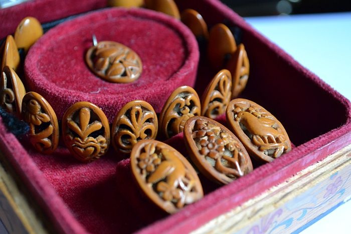 Unikátní souprava ručně vyřezávané pecky ovoce. Pecky jsou o velikosti cca 1,8 x 1,2 cm, velikostně se samozřejmě drobně liší. V zachovalém stavu v původní, ručně vyrobené krabičce. Souprava obsahuje, náramek, brož, přívěsek. Překrásná jedinečná souprava v krásném stavu. U náramku konce šnůr mírně otřepené, lze zastřihnout. Zaslání na dobírku, nebo převzetí osobně v Ledeč nad Sázavou.