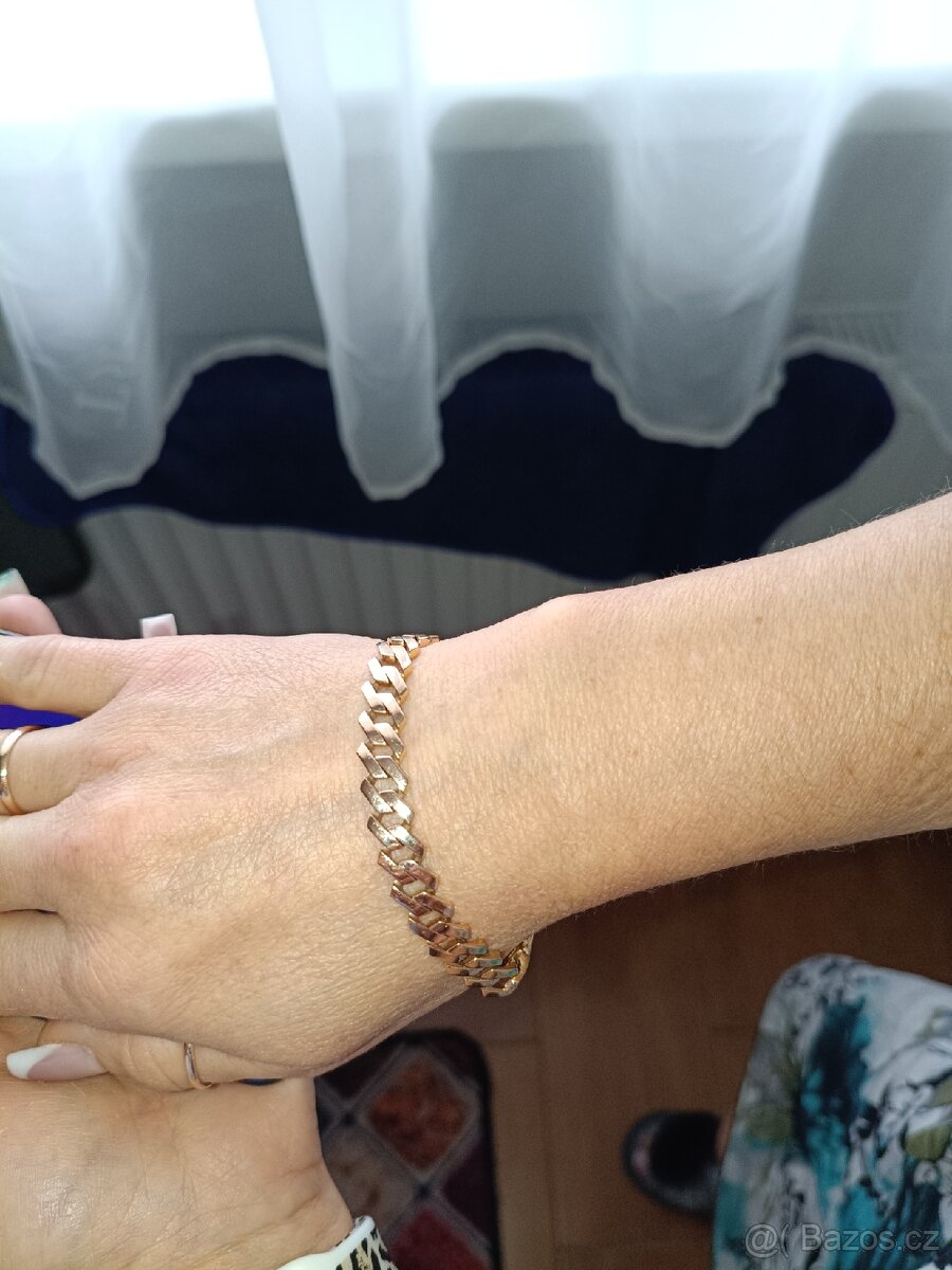 K dispozici je pravý dámský zlatý náramek, ryzost 585, hmotnost 14,9 gramů.Délka 18 cm, šířka 7 mm. Chybí dva kamínky, jak je vidět na fotce. Dohodou možná.