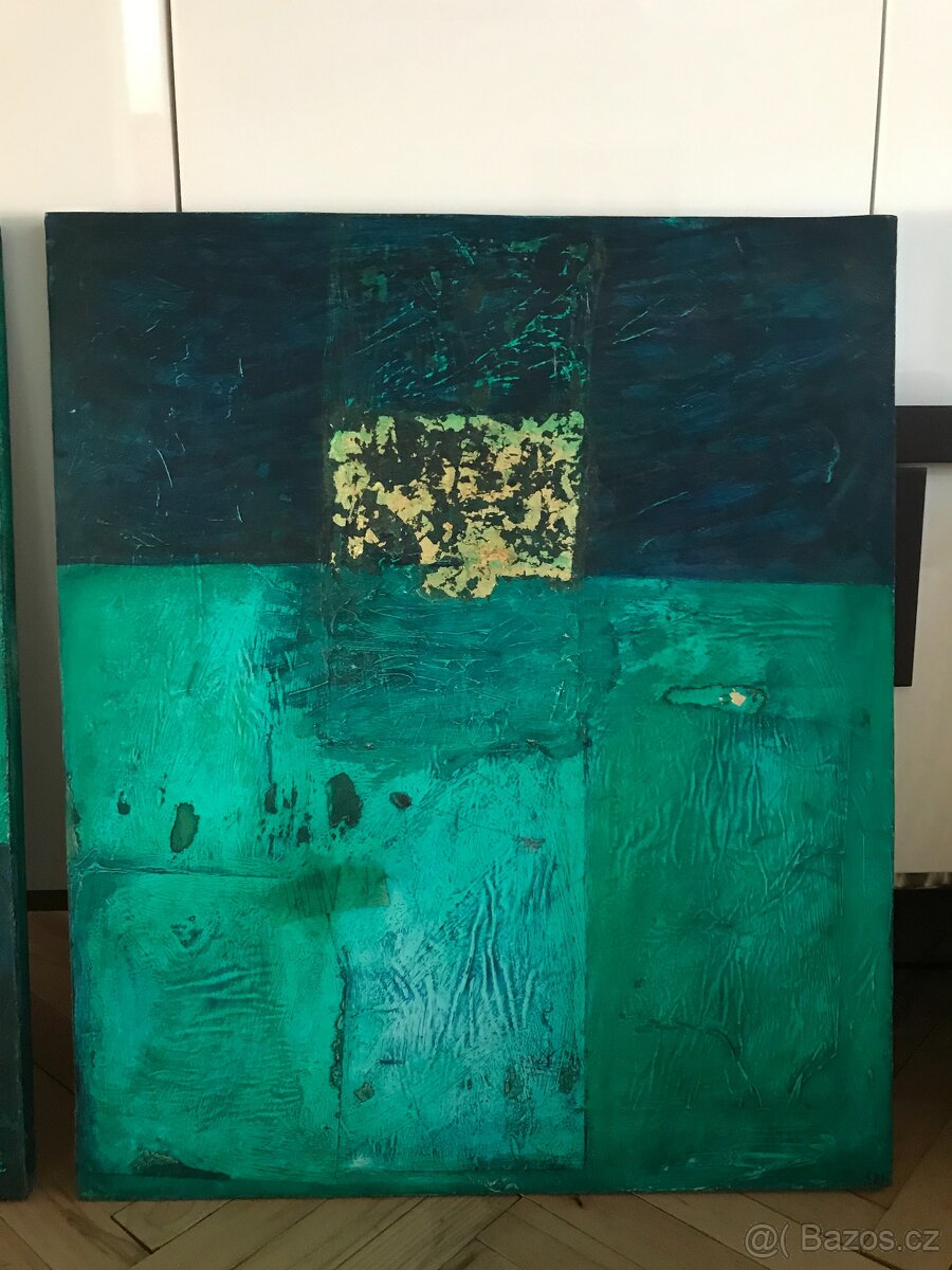 Diptych,V66x57cm,akrylmalba s kolážou,prekladaná pravým plátkovým zlatom na drevennom ráme,názov Horšia polovica,rozmer uvedený jedného obrazu,možnosť kúpy aj jednotlivo,kus 600eur