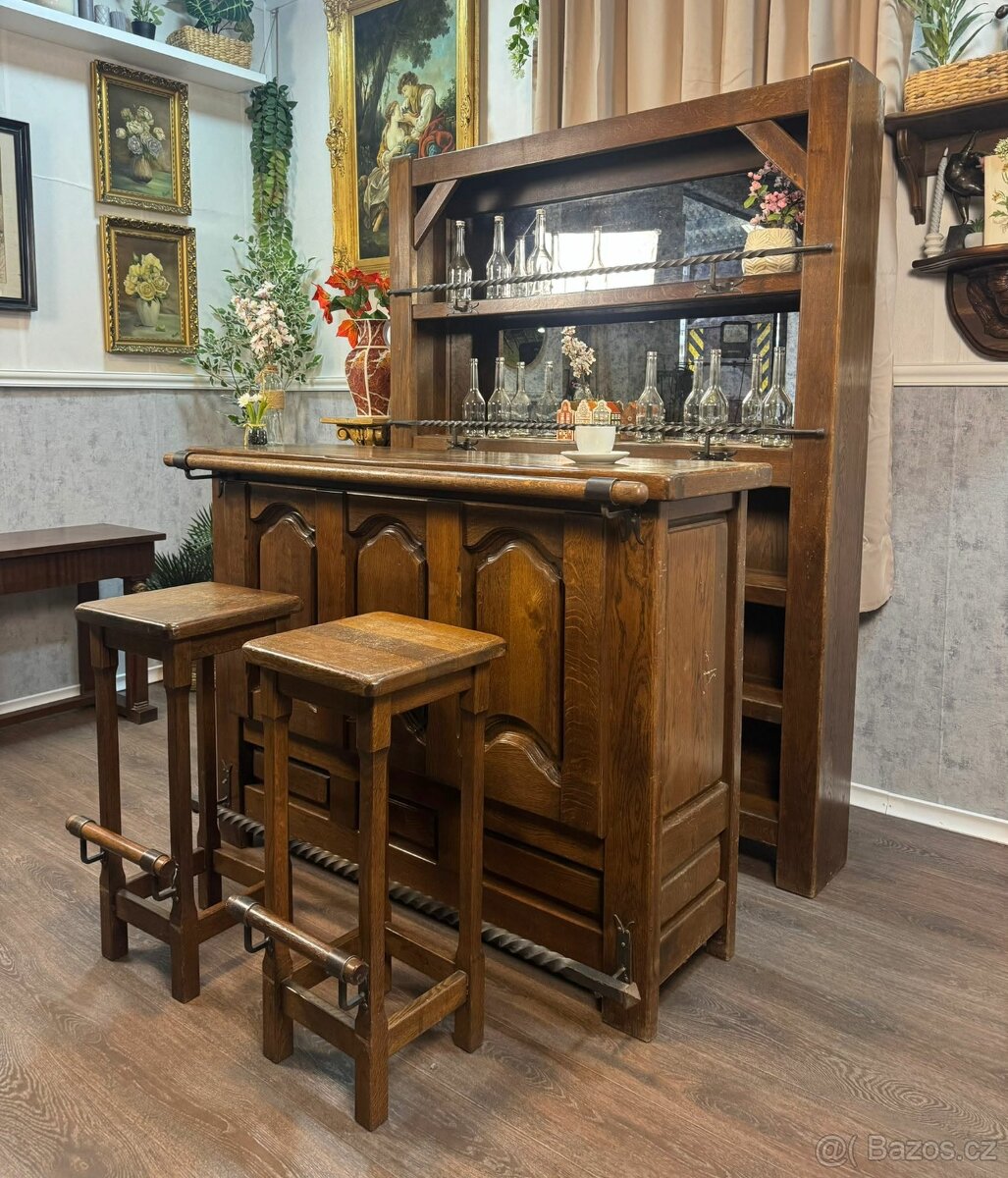 Výrazný a velmi autentický barový komplet z masivního dubu, který v sobě nese atmosféru starých hospod, vináren a klubů. Celek působí robustně, poctivě a přitom elegantně ideální do stylového interiéru, domu, vinného sklepa, baru, kavárny či pánského salonu.
