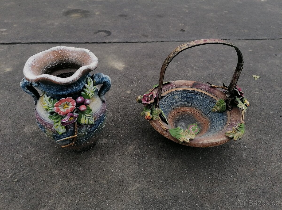 Predám keramickú vázu a košík. Pekné reliéfne 3D kvetinové a listové motívy. Výška vázy 21cm, výška košíka 23cm, priemer 24cm. Cena spolu 390 kč. Slovensko- Myjava 7 km od hraníc z ČR