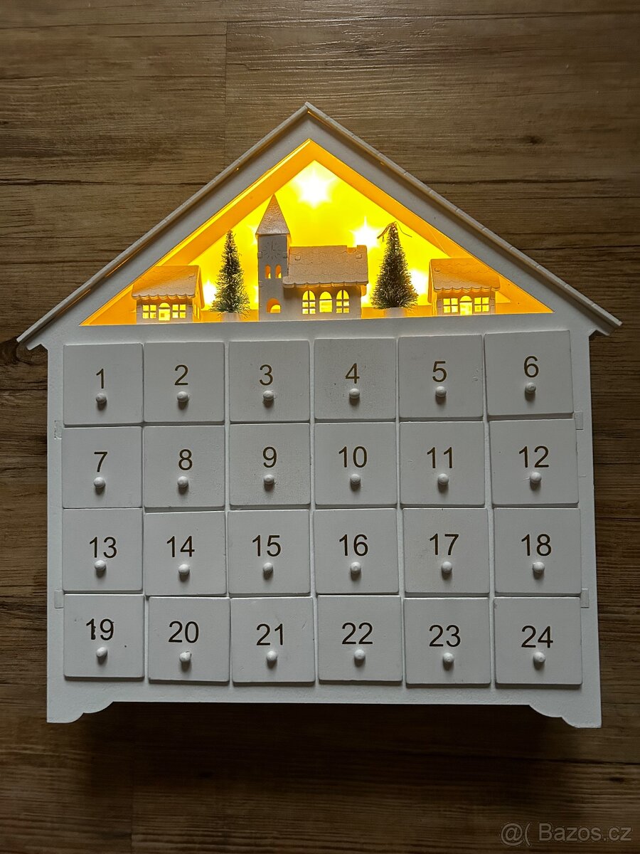 Nádherný vkusný adventní kalendář ze dřeva ze 24 vysouvacími šuplíčky. Osvíceno 10 LED světýlky, automatické vypnutí. Rozměry 33 cm na šířku a 35 cm na výšku. Jako nový, použitý pouze 1 rok. Koupeno na Mall.cz za 900 Kč. Baterie součástí ceny, v originální krabici. O ceně nebudu smlouvat, nepotřebuji prodat za každou cenu.